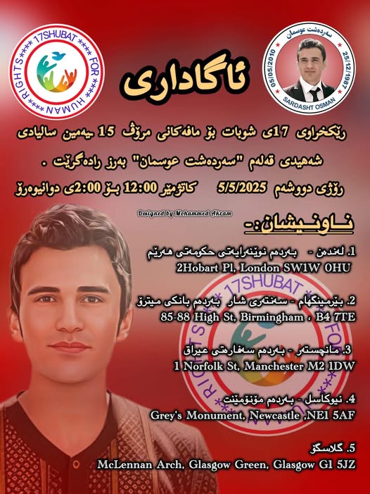 رێکخراوی ١٧ی شوبات بۆ مافەکانی مرۆڤ 15ـیەمین سالیادی شەهیدی قەلەم “سەردەشت عوسمان”