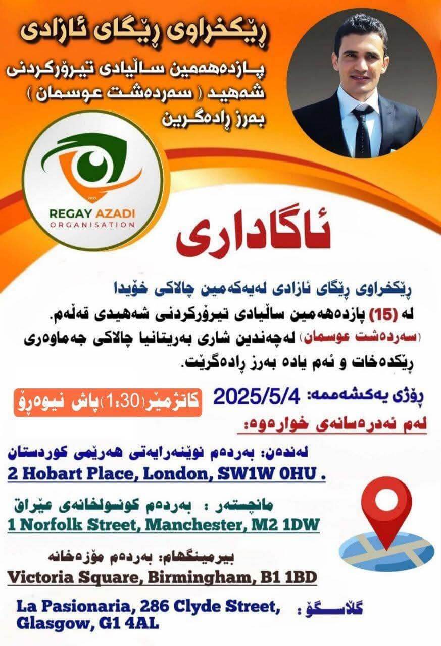 لە ٤-٥-٢٠٢٥، ڕێکخراوی ڕێگەی ئازادی، چالاکیەکی جەماوەری لە سەرانسەری بەریتانیا ڕێکدەکات بە بۆنەی ١٥ ساڵەی تیرۆرکردنی دڕندانەی سەردەشت عوسمان – ڕۆژنامەنووسێکی چاونەترس کە تاکە تاوانی ئاشکراکردنی ڕاستییەکان بوو.