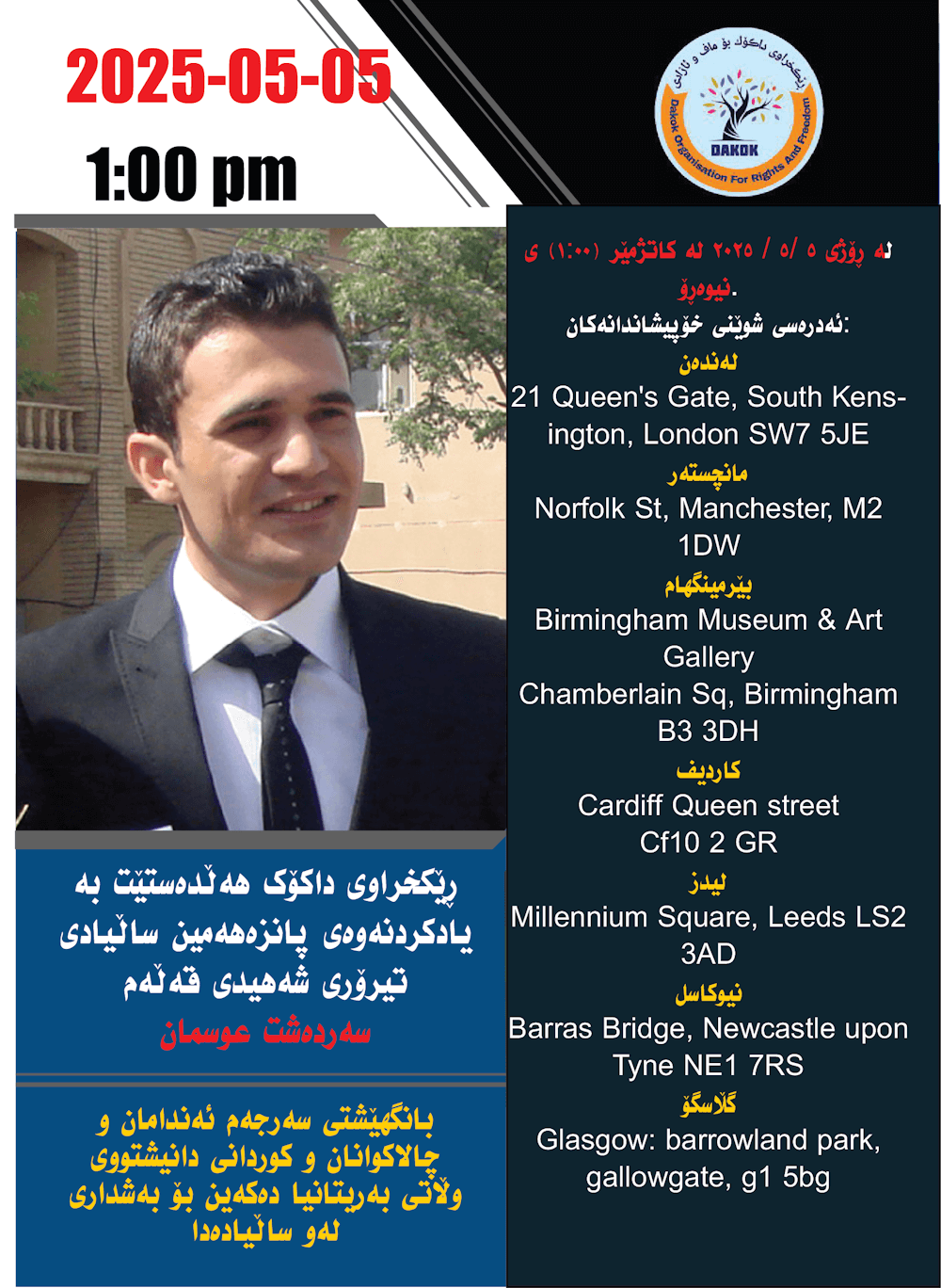 بانگهێشتی سەرجەم ئەندامان و چالاکوانان و کوردانی دانیشتووی وڵاتی بەریتانیا دەکەین بۆ بەشداری لەو ساڵیادەدا